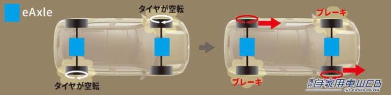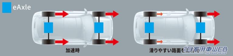 4WDモデルには、前後2つのeAxleを配置した電動4WD「ALLGRIP-e」を採用。路面状況に応じて各制御を最適化し、優れた操縦安定性と悪路走破性を実現する「オートモード」と、タイヤが浮くような路面でも空転したタイヤにブレーキをかけ、反対側のタイヤに駆動力配分(LSD 機能)することで、悪路からスムーズに脱出できる「トレイルモード」の2つのモードが設定され、優れた走破性とパワフルな走りを実現する。