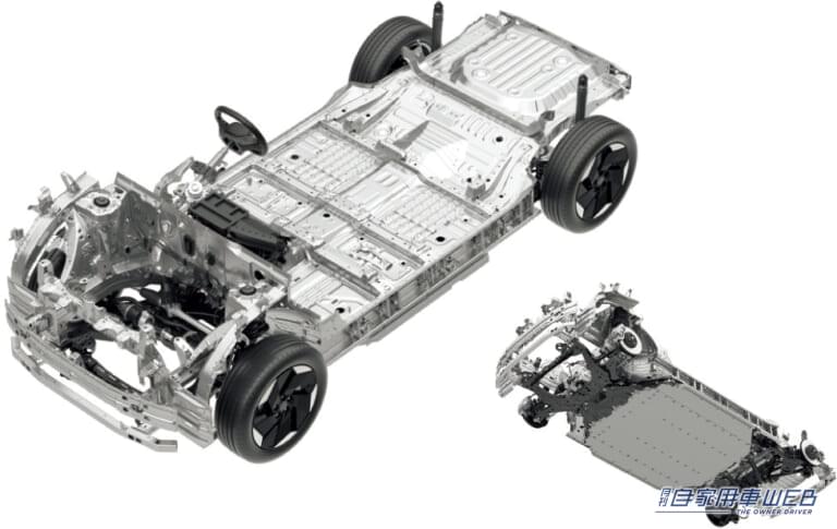 プラットフォームは、BEV専用に新開発された「HEARTECT-e」を採用。ショートオーバーハングによる広い室内スペースを実現するほか、高ハイテン材の使用率を従来のプラットフォームより上げることで重量低減を達成。最小回転半径は、ロングホイールベース&タイヤの大径タイヤを採用しながらも、タイヤの切れ角を大きくすることで、5.2mを実現する。