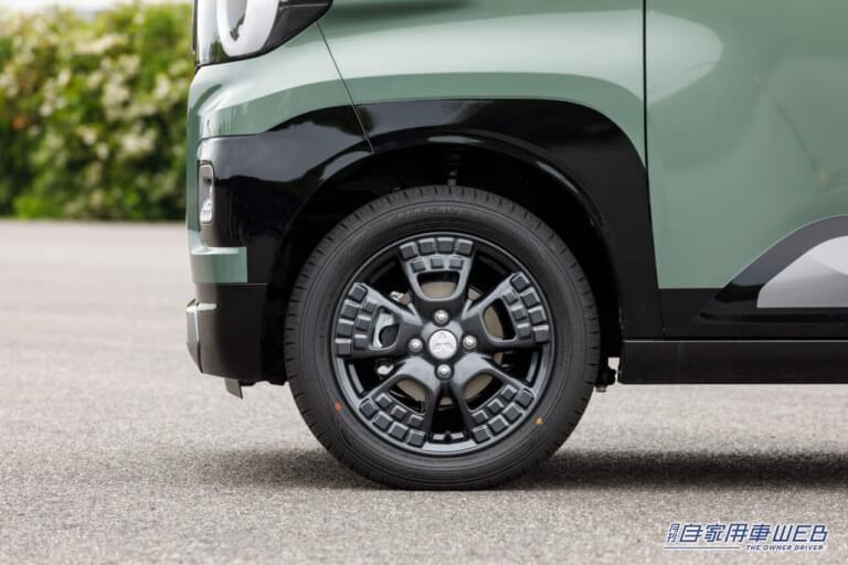 4WD車の15インチアルミホイールは、トレッキングシューズの靴底をモチーフにして悪路走行性能の高さをイメージさせた幅広な5本スポークを採用。