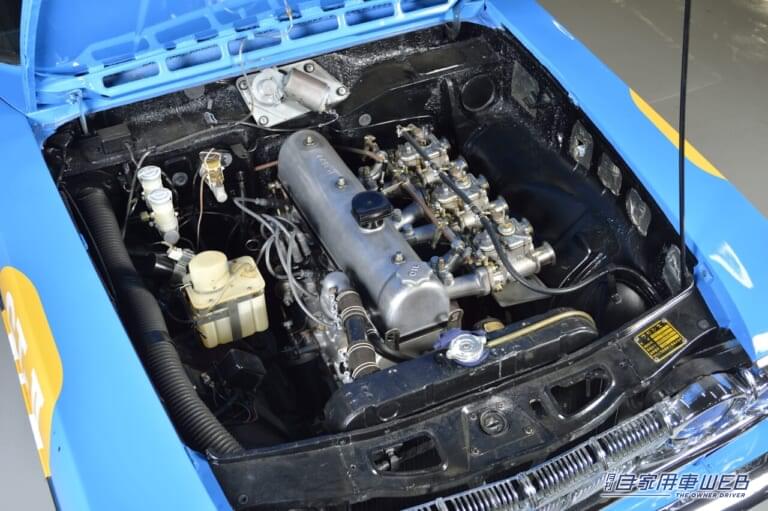 4気筒のスカイライン1500 をベースにホイールベースを200㎜延長し、上級モデルであるグロリアスーパー6のG7型2000㏄直列6気筒エンジンを搭載するというアクロバットをやってのけたのだ。その結果、5月2~3日にかけて開催される第2回日本GP直前の5月1日、当時のGTカテゴリーのレギュレーションに合わせるべく100 台のみが限定生産・発売にこぎつけたのがこのスカイラインGTである。