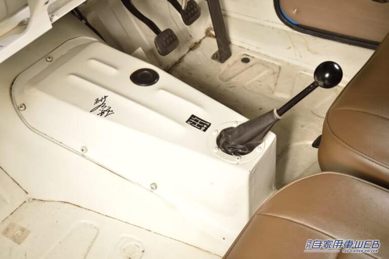 レース車両なので当然といえば当然なのだが、必要な操作類以外はすべて外されたインパネ周り。ステアリングの中央部にはギアシフト図が描かれている。インパネ上部に設置されているメーターは回転計。
