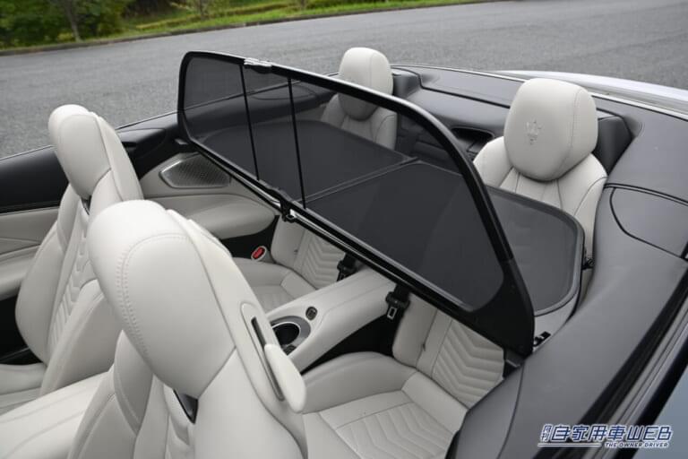 面白く感じたのは、後席の上に設置するウインドウストッパーも存在だ。折り畳み式で脱着は手動とプレーンな機能装備なのだが、効き目は抜群。風の巻き込みは明らかに激減する。2人乗車でのオープン走行限定になるが、これはかなり関心させられた。