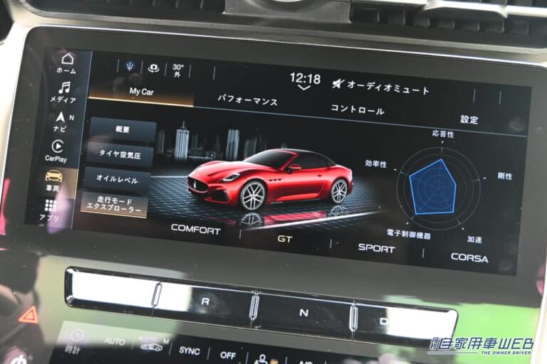 グランカブリオには、グラントゥーリズモから採用が始まった電子制御技術「車両ドメインコントロールモジュール(VDCM)」が搭載されている。ステアリングホイールの右下にあるセレクターを使うことで、「コンフォート」「GT」「スポーツ」「コルサ」の4つのドライブモードが選択可能で、具体的には、エンジンやサスペンション、パワステなどのセッティングが制御され、「応答性」「効率性」「電制」「加速」「剛性」という5項目が変化する。当然、「コンフォート」ではハンドル操作が軽く、ダンパーも緩くなる。そして「GT」から「スポーツ」、サーキット走行向けの「コルサ」という順で、どんどんスパルタンな味付けに変化してゆく。個人的には、「コンフォート」は緩すぎだったので、「GT」が最も好みな走行モードだった。