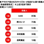 |「あぁ、確かに!」1位 ヒロミさん、 2位 所ジョージさん、3位 ヒロシさん。思った以上にイメージにピッタリ!納得のランキング。アウトドア系カスタムカーが似合うと思う芸能人。