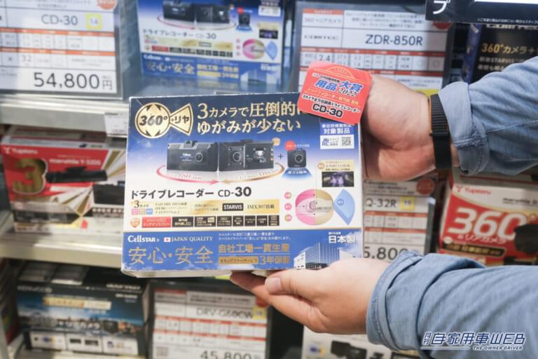 次に紹介していただいたのは、車外の前後のみならず、車内の映像もキャッチする360°+リヤ3カメラ録画タイプのドライブレコーダーの売れ筋モデル、セルスター「CD-30」。