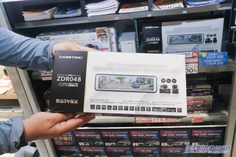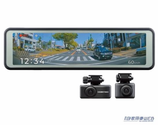 コムテックのデジタルインナーミラー「ZDR-048」は、フロント側を撮影するカメラも標準装備。ドライブレコーダーの機能をオプションなしで備えたモデルになっている。