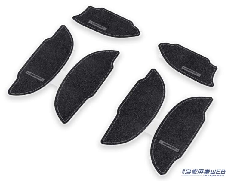 ドア開閉時の爪跡・キズ防止だけでなく、レザー調のデザインを採用することでドアハンドル回りのドレスアップ効果も期待できる。素材は自動車メーカーの純正採用部品と同等の高品質PVC材を採用する。