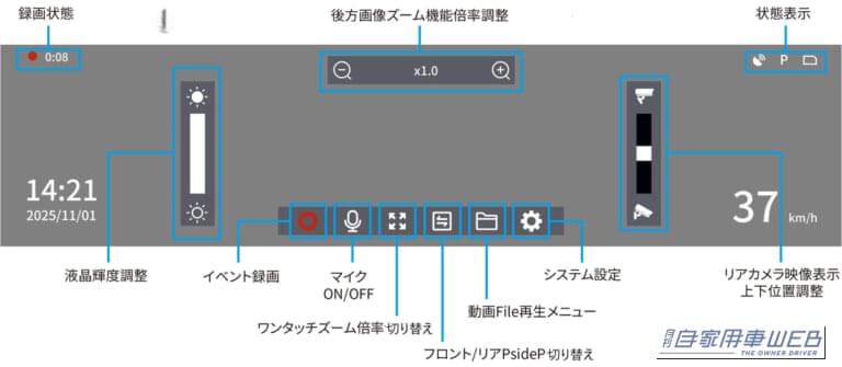 高輝度IPS方式を採用した11V型の大画面液晶。走行中でも映像をしっかりと確認できる。最大3倍のズーム機能を搭載しており、後方車両との距離感などを調整できる点も嬉しい。
