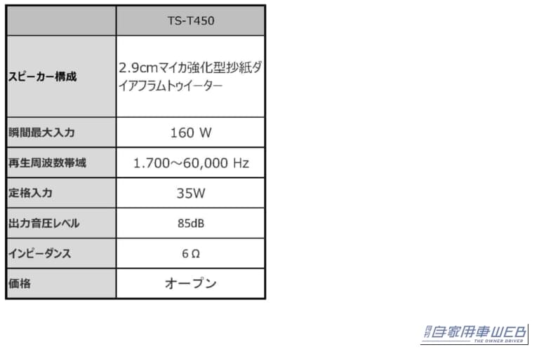 広帯域にわたる低歪み化と60 kHzまでの超高域再生を実現する新開発の「2.9cmマイカ強化型抄紙ダイアフラム」と、振動板への伝達ロスを軽減する「頂点駆動方式」、クリアでメリハリのある音を実現する「ネオジムマグネット」を採用。音像定位に優れた明瞭感のある音を再生する。また、ダッシュボードに取り付けた後でもトゥイーターの角度を上下41°、左右32.6°まで調整できる「可動式台座」を採用することで、ドライバーにとって最適な向きに角度調整が可能となる。