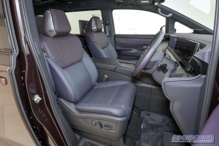 ドアトリムにエクステリアの組子パターンと統一感を持たせたキルティングを施し、日本の美意識に息づく紫が採用された内装色「紫檀-シタン-」によって、高級感あふれる特別な空間を演出する。
