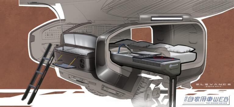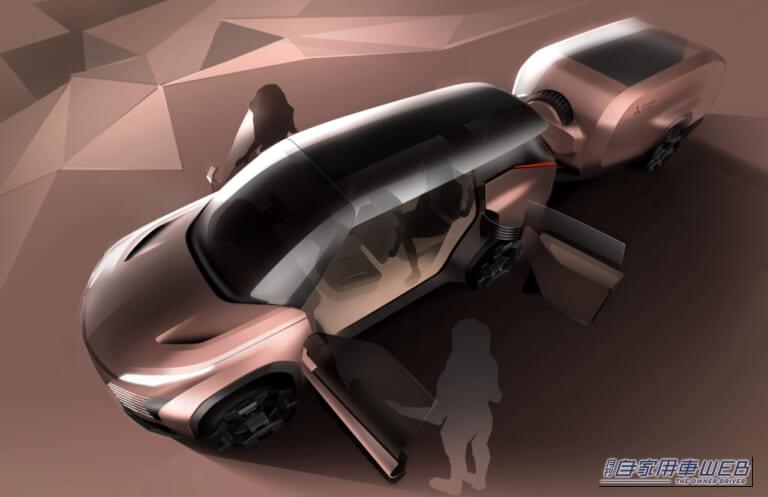 また、レジャーユースを想定したトレーラーも連結されることも、新しいアプローチのひとつ。広々とした室内空間を持つトレーラーは、キッチンやシャワーブースを備え、PHEVシステムからの給電を組み合わせることで、車中泊をグランピングのように上質かつ快適に過ごすことが可能という。