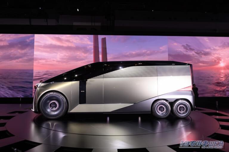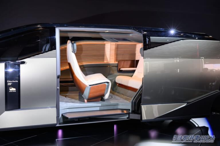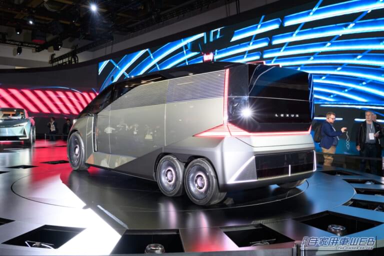 驚きの6輪スタイルのミニバンとしてで世に繰り出された「LEXUS LS Concept」。リヤタイヤを小さめの4輪とすることで、ボディ設計の自由度を向上させる狙いも。低床化がさらに強化されたことで、ショーファーニーズにより特化したキャラに仕立てられている。