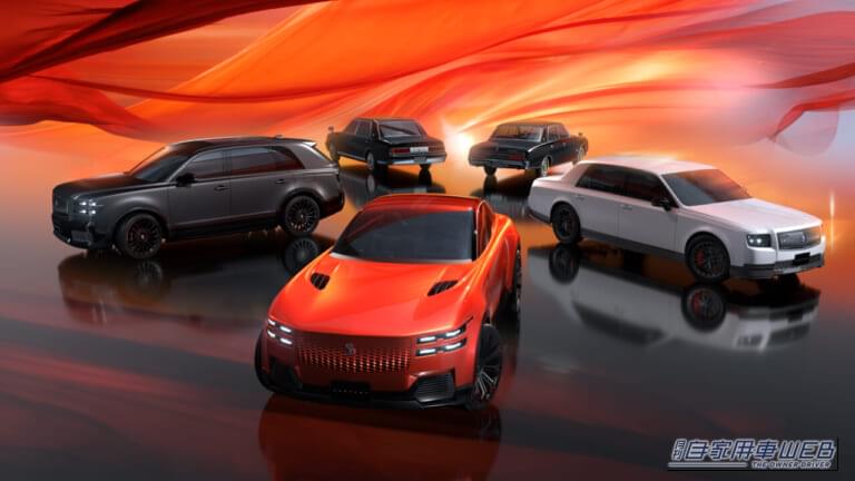 赤く輝くクーペボディは、伝統的なショーファーカーの既成概念を打ち破り、最低地上高を高めたSUV的なパッケージングを採用。