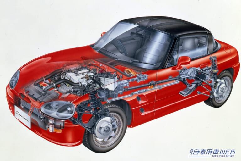 駆動方式は、FFが主流の軽自動車にあって、あえてFRを選択。エンジンをフロントミッドシップに縦置きすることで、理想的な前後重量配分(51:49)を実現することで、本格的なスポーツカーとしての性能を追求している。足回りもこだわりが強く、当時の軽自動車では唯一、前後ダブルウィッシュボーン式サスペンションを採用し、さらに4輪ディスクブレーキ(前輪はベンチレーテッド)など、走りに対する本気度は群を抜いていた。