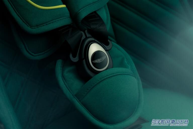 シートベルトと股ベルトをつなぐバックルにもアストンマーティンのエンブレムを採用。ハニカムパーターンのホイールは、ValourとVictorからインスピレーションを得たもの。センターハブにはロータリーコントロールのテクスチャーから着想を得たグラフィックが付される。