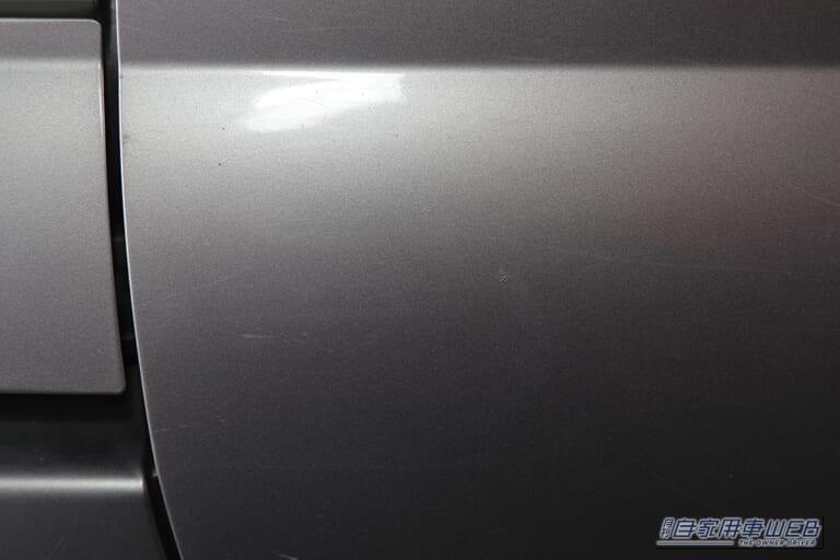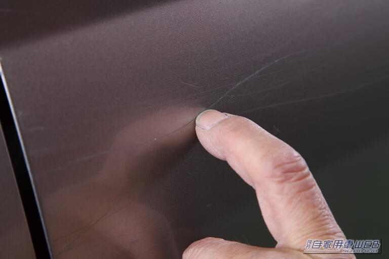 爪が軽く引っかかる程度の筋状の擦りキズは、塗装表面のクリア層に浅い溝が入っている状態で、コンパウンドで磨けばたいてい消せる。凹凸を伴っていたとしても周囲の複数の白いスジが消えればかなり目立たなくなるので、ダメ元で磨いてみるとよい。