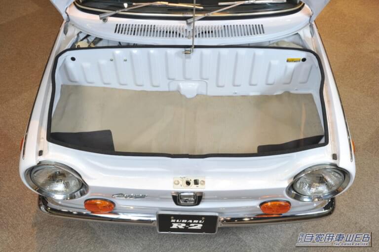 積載スペースのプアなことは否めなかったスバル360の改良点として「家族旅行も可能なトランクスペース」として、フロントボンネットに創設された210L容量のトランクルーム。スクエアな空間は広さもさることながら使い勝手も良い。