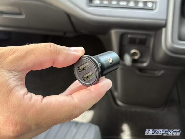 シガーソケットに装着するUSB充電器(12V車専用)が付属。