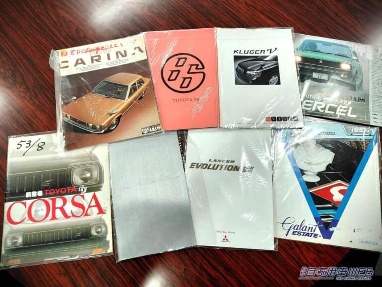 当時の新車カタログをメーカーごとに取り揃え、1冊100円~で販売。