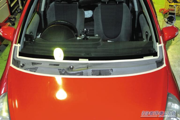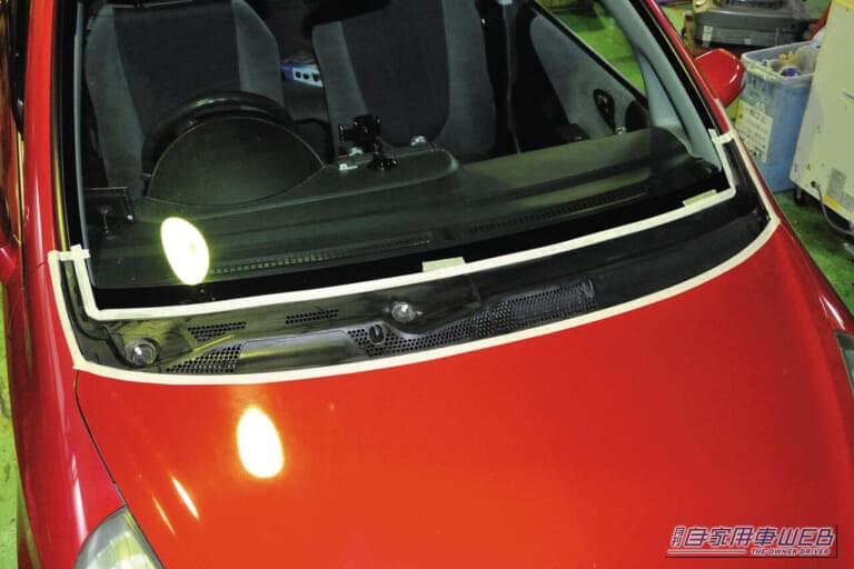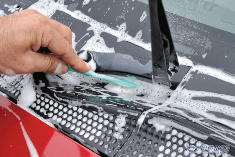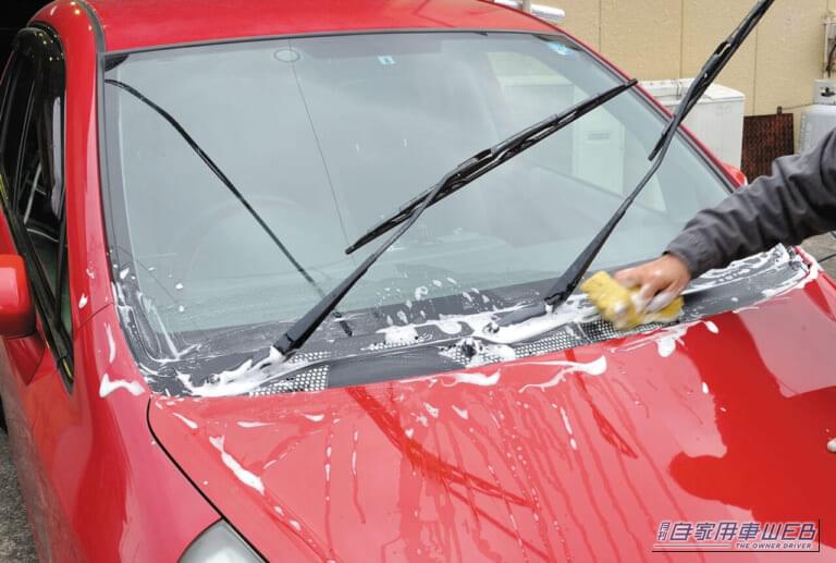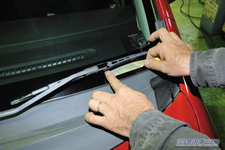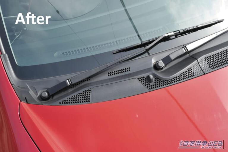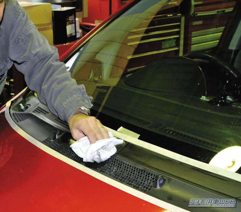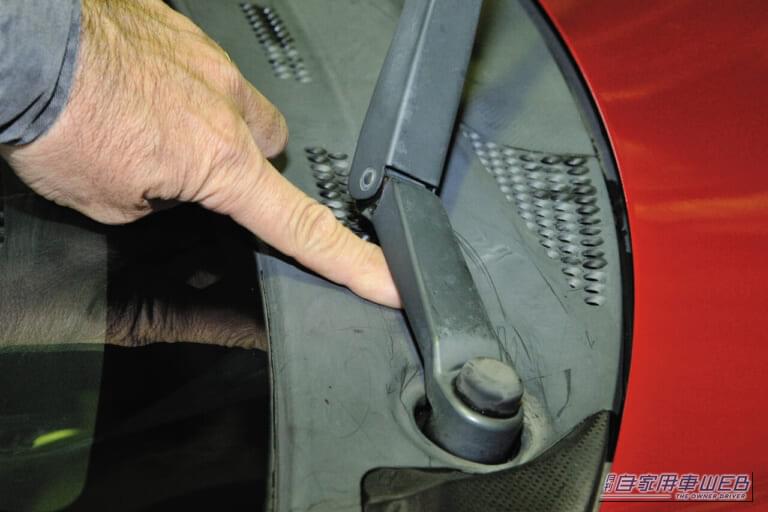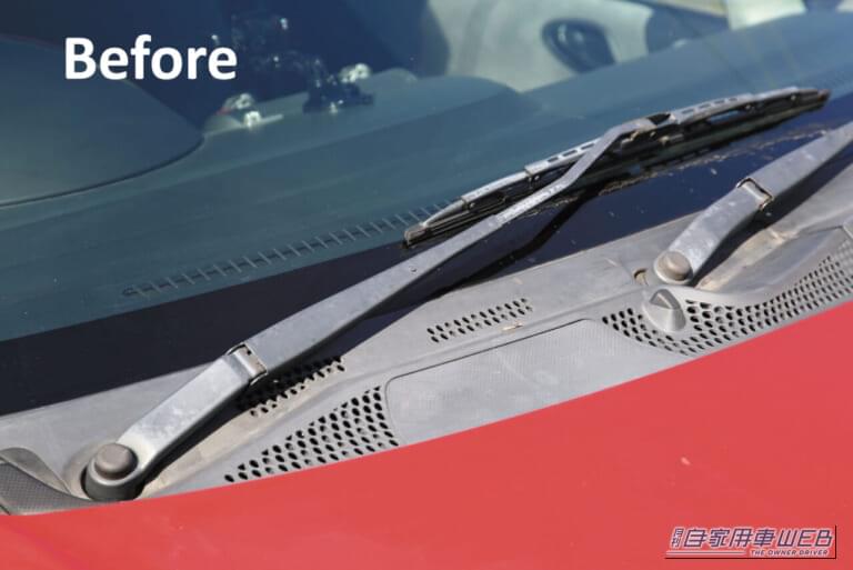 ワイパーアーム周辺には雨水と共に流れてきた砂ボコリやゴミが堆積しやすい。このような汚れはコート処理の大敵。確実に取り除くこがオススメ。