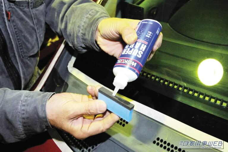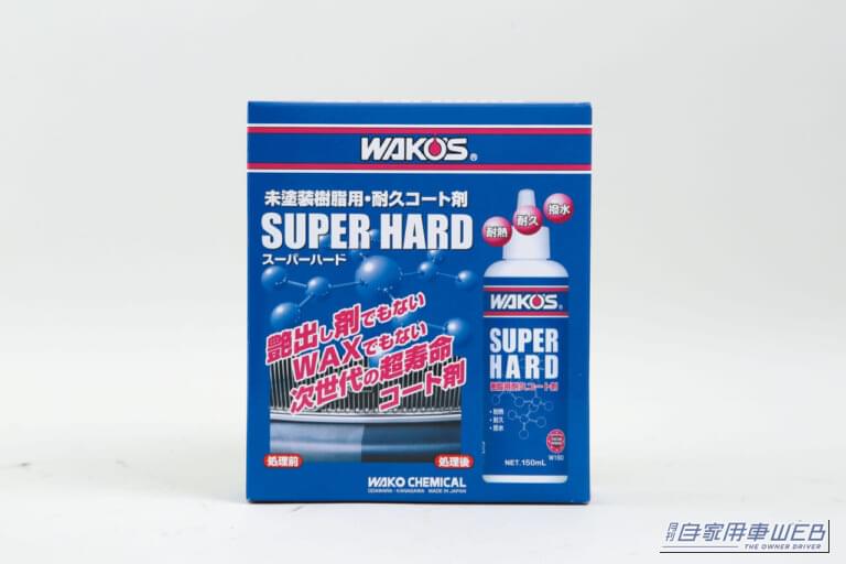 今回は、ケイ素化合物が、未塗装の樹脂表面にガラス状の硬質な皮膜を形成することで、見違えるような艶を復活するという「ワコーズSH-R スーパーハード 未塗装樹脂用耐久コート剤 」を試してみることにしよう。まずは洗車で汚れをきっちり取り除いてから施工する。手順は以下の通り。