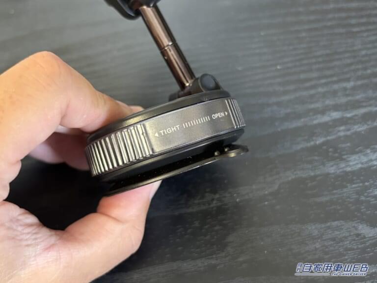 本体底部にはダイヤル式の真空吸盤が用意されており、これが想像以上に強力だった。ダイヤルを“オープン”にしたままガラス面に押し当て、反対方向へ回すと吸着が完了する。手順自体は非常にシンプルだが、固定された時の安定感は驚くほど高い。