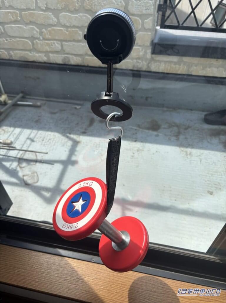 車内のガラス面に取り付けて揺すってみてもびくともせず、吸盤タイプにありがちな“じわじわ落ちる”気配がまったくない。さらに室内の窓で試したところ、2.5kgのダンベルをぶら下げても外れないという実験結果が得られた。スペック上は10kgまで耐えられるとされており、数字だけを見ればヘビー級の固定力だ。
