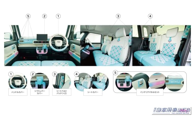 内装アイテム(5種類):車内は一転、テーマカラーのミントグリーンやチェック柄がふんだんに使われ、プライベート空間での没入感を高める工夫がなされている。