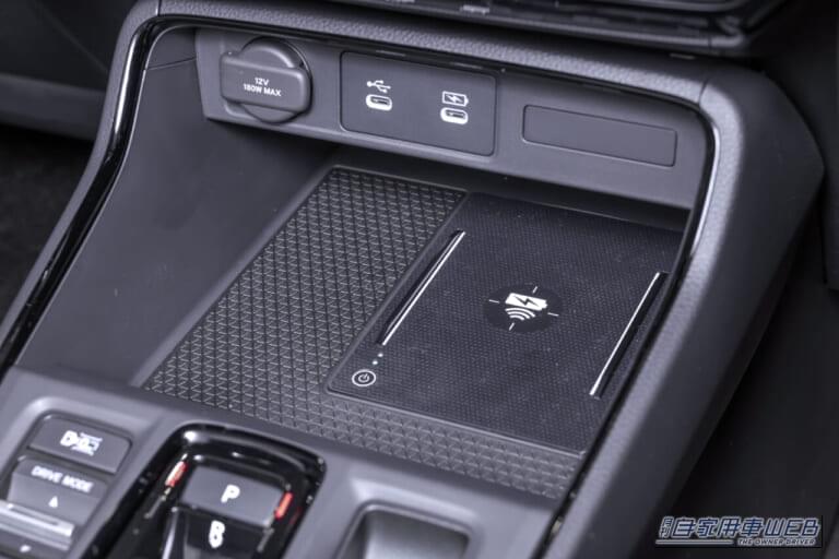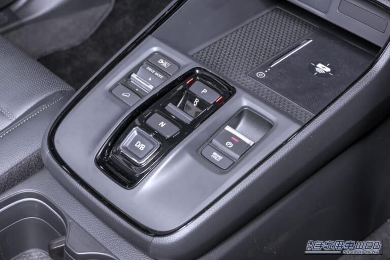 センターコンソールには、e:HEV用のシフトスイッチや電子パーキングの物理スイッチが備わる。コンソール奥にはスマートフォン用の非接触型充電器やUSBソケット口が配置される。