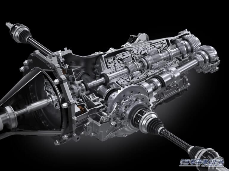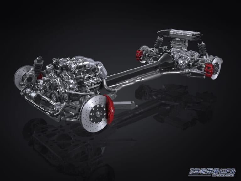 エンジンが生み出した動力はCFRP製トルクチューブを介し、モータージェネレーター、トルクコンバーターを廃したWSC採用の8速AT、機械式LSDを一体化したリヤトランスアクスルへ伝達。開発目標値はシステム最高出力650ps以上、最大トルク850Nm以上。前後重量配分は45:55となる。