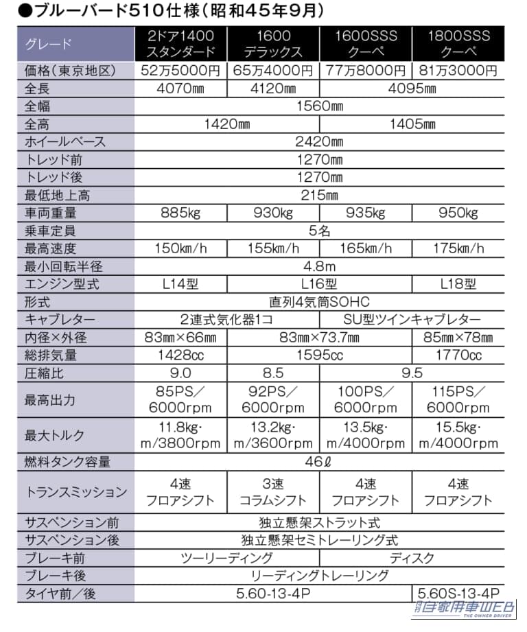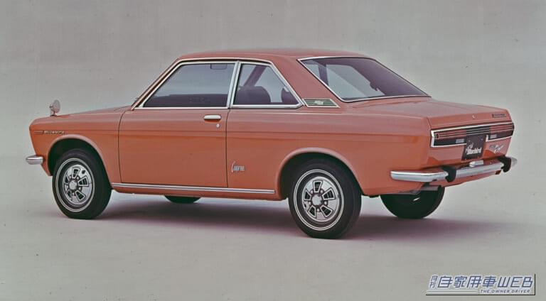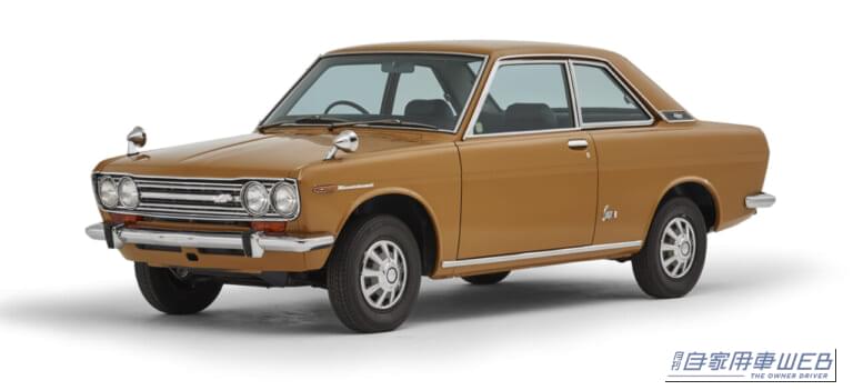 2ドアクーペ(510):日本車初のピラーレスを謳い人気となったコロナ2ドアハードトップに対抗して、1968年11月に追加された2ドアクーペ。