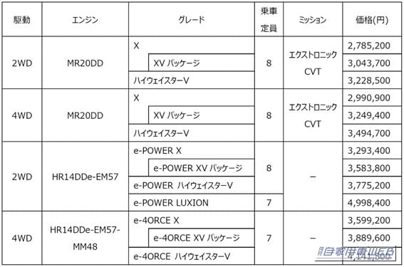 全国希望小売価格は、ガソリン車の「X(2WD)」が278万5200円から。最上位グレードの「e-POWER LUXION(2WD)」は499万8400円となっている。