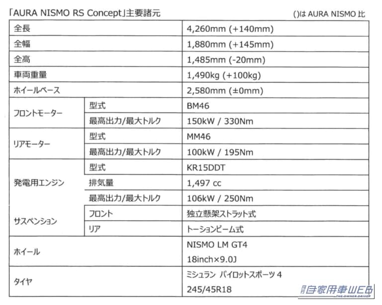 「AURA NISMO」のコンパクトなボディをベースとしながら、パワーユニットには「X-TRAIL NISMO」の強力なシステムが移植されており、フロント150kW(330Nm)、リヤ100kW(195Nm)を発生する高出力モーターを搭載。これに伴い、発電用エンジンも1.5リッターのVCターボエンジン(KR15DDT)へと換装され、バッテリー容量も1.85kWhへと増強されている。