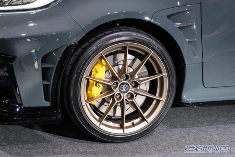 タイヤサイズは225/40R18。ブロンズのアルミホイールと組み合わされる。ブレーキキャリパーにはモリゾウのシグネチャーカラーであるイエローが配される。