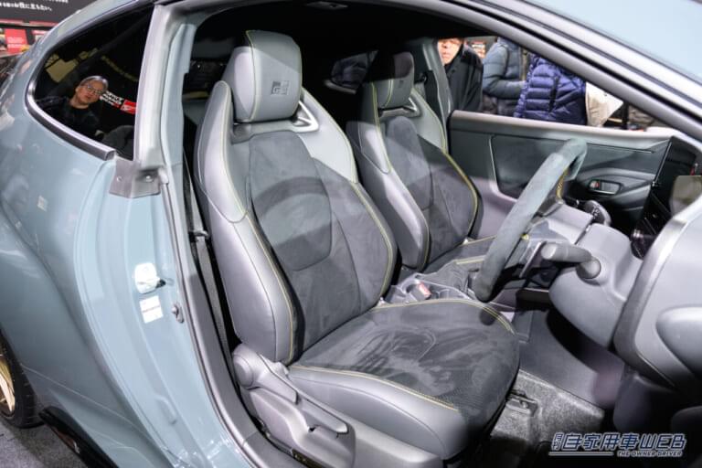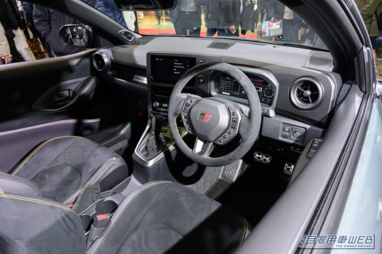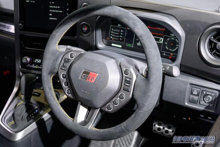 スエード表皮を使ったステアリングホイールには、GRヤリスRally2からの学びを得て、各種スイッチが独立した形状で配置される。