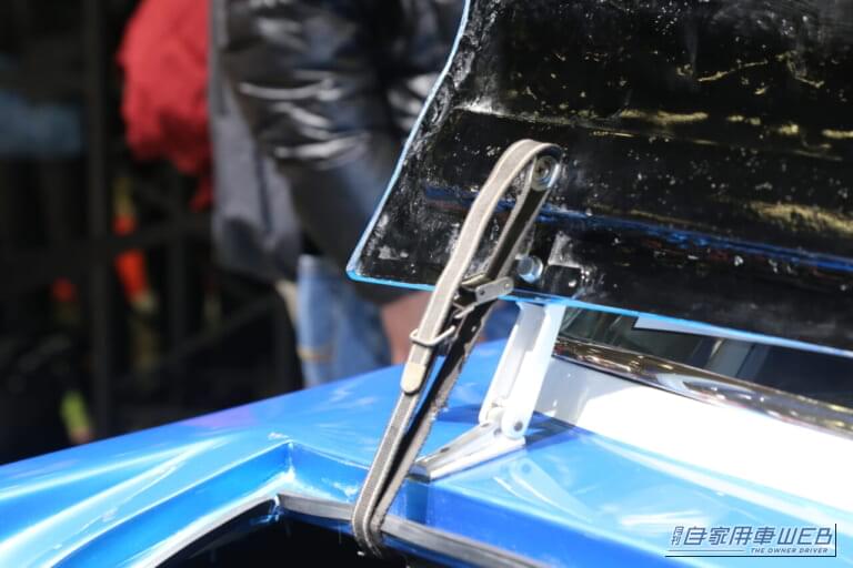 トランクフードはFRPで造形。ヒンジはブルーバードの純正パーツを使用し、レザーのベルトまでベース車から流用している。