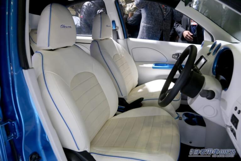 内装は学生が考えたボディカラーの「スカイミラージュ」というツートーンに合わせてホワイトを基調にブルーのアクセントを加えてコーディネイトされている。