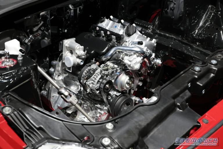 ランニングプロトでは67度に傾けられていたエンジンは、40度の角度に変更。触媒とターボの位置を適正化するとともに、搭載位置を前輪より後方としたフロントミッドシップとしている。軽自動車規格のFRオープンスポーツカーといえどもサーキット走行にも耐えうる施策が採られている。