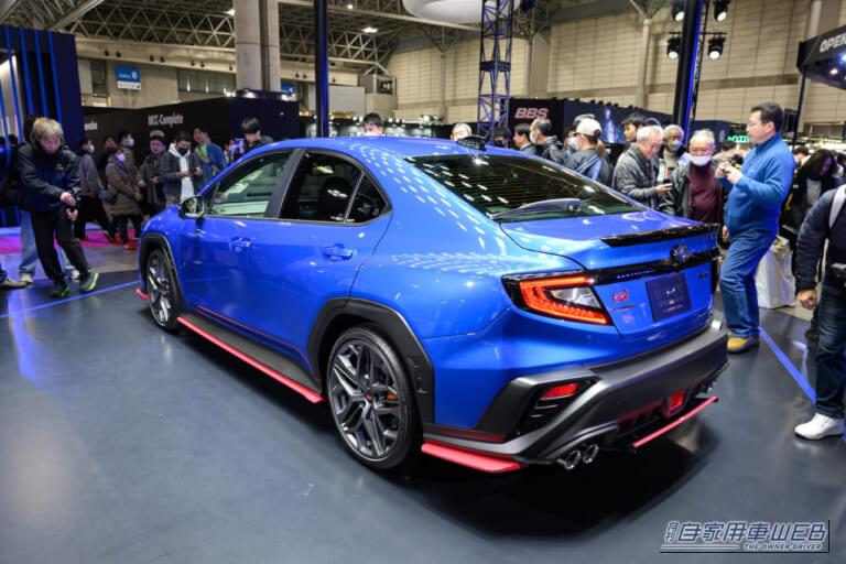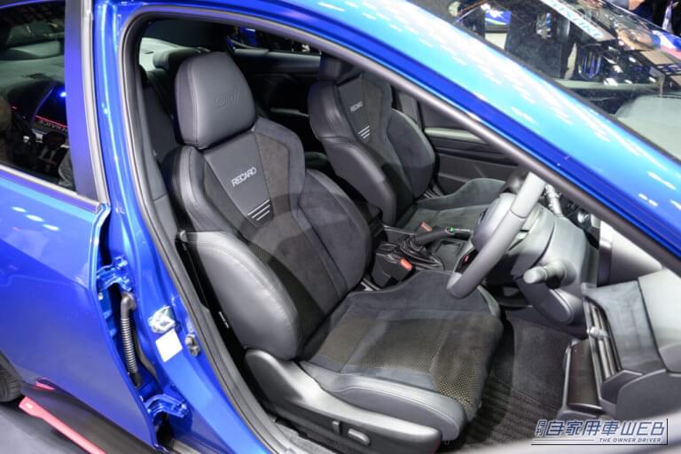 「WRX STI Sport#」は、日本仕様として現行モデルでは初となる6速MTを搭載し、「MTの復活」を高らかに宣言。オートサロンで展示されていた車両のボディカラーはブルーで、アルミホイールの隙間からはゴールドのブレンボ製キャリパーがちらりと覗き、シートにはレカロの文字が入って外観からしてゾクゾクさせる、往年のモータースポーツシーンを彷彿とさせる要素が揃っている。