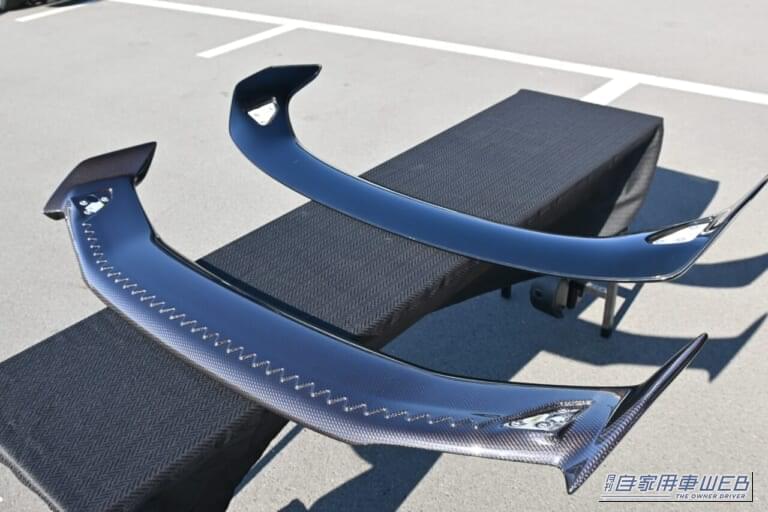 ホンダアクセスの実効空力を体感するために用意された2枚のテールゲートスポイラー。手前のシェブロン(鋸歯)が見えるものがホンダアクセス製、奥が純正品となる。
