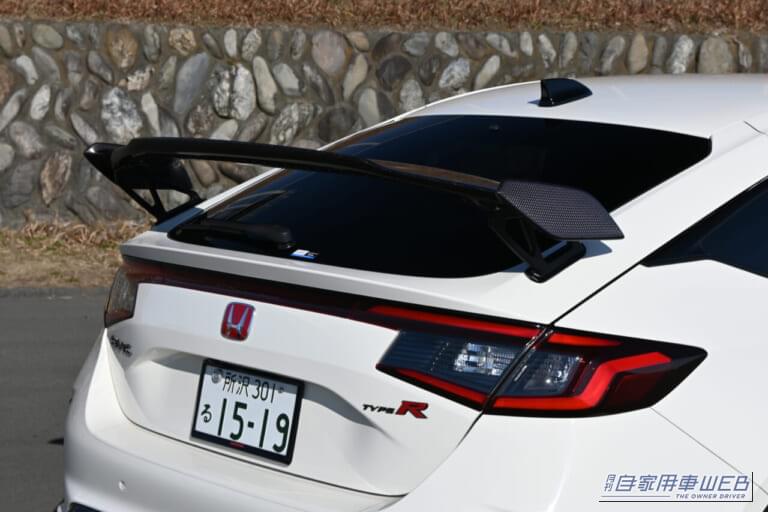 ホンダアクセスのテールゲートスポイラーを装着した「シビックタイプR」。美しいカーボン地と、翼端板の形状の違いが見て取れる。