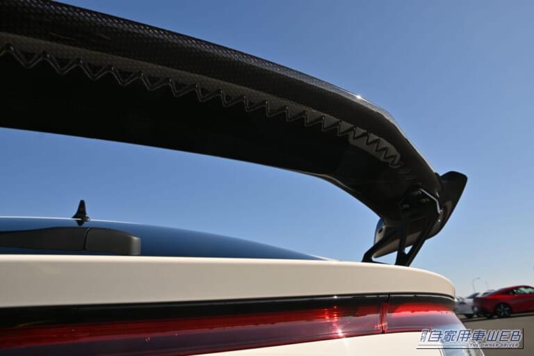 ホンダアクセス製のテールゲートスポイラーを、下から覗くと、シェブロン(鋸歯)を確認することができる。空気の乱流が発生することで、ダウンフォースがより強く発生するのだ。