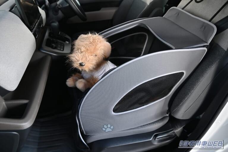「フリードAIR」に装備されたホンダドッグの「ペットシートプラスわん2」。助手席エアバッグの展開をなるべく避ける形状をしているのが特徴だ。