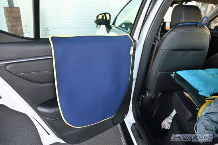 愛犬がドアの内張を傷つけないための「ペットドアライニングカバー」。ドアと窓のガラスの隙間に上部をひっかけるだけという簡単装着だ。
