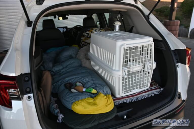 「WR-V」は、愛犬と共に車中泊を行えるようにした車中泊仕様。大型のケージがあっても、大人がまっすぐに寝ることができる。