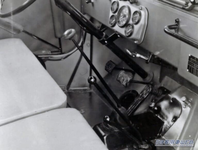 3型の運転席。床から伸びる3本のレバーのうちもっとも長いのが3速マニュアルトランスミッション。残りの2つはトランスファーケースのレバーで、1本が後輪駆動と4輪駆動の切り替え、もうひとつがハイ/ローの切り替え。ちなみに1961年以前まで三菱ジープは左ハンドル仕様しかない。