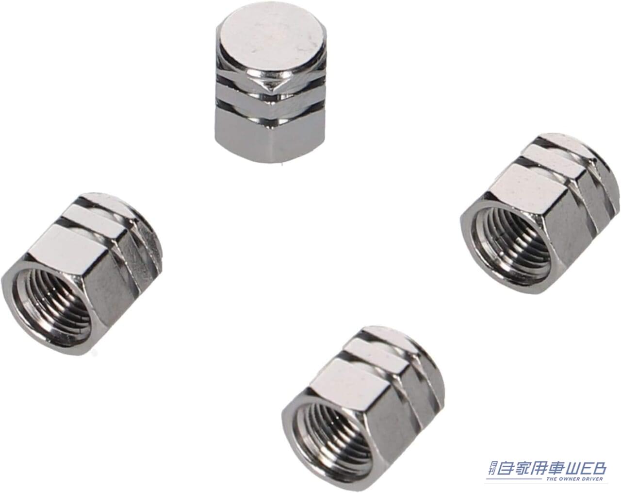 エーモンのエアバルブキャップ(8828)は、写真の通り金属製のネジが4個入っている。そう、この製品はその名の通り、タイヤのエアバルブキャップとして使用するもので、純正の黒い樹脂製のキャップと交換して装着する。