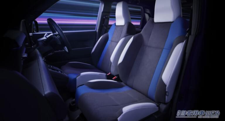 前席は専用のバケットタイプシートを採用。シート地はブラックとホワイトの生地に鮮やかなブルーのアクセントが印象に残る。