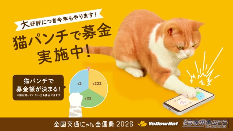 イエローハットは、2月22日の「猫の日」に合わせ、猫を交通事故から守る啓発活動「全国交通にゃん全運動」を今年も開催する。8年目を迎える今回は、渋谷でのリアルイベント「猫パンチで募金」を初開催。参加者が猫になりきってミット打ちをする得点に応じ、同社が保護猫団体へ寄付を行うというもの。WEBでも愛猫や飼い主が参加できる募金企画や新CM公開など、猫と人が安心して暮らせる社会を目指す多彩な施策を展開中だ。