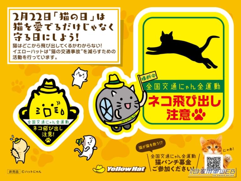 カー用品専門店を全国展開するイエローハットでは、2月22日の「猫の日」に向け、猫を交通事故から守るための啓発活動「全国交通にゃん全運動」キャンペーンを今年も実施する。